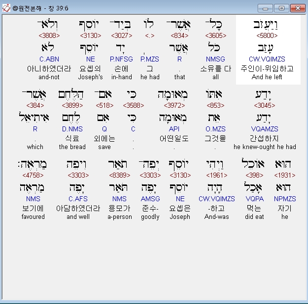히브리어구약BHS,6 וַיַּעֲזֹב כָּל־אֲשֶׁר־לֹו בְּיַד־יֹוסֵף וְלֹא־יָדַע אִתֹּו מְאוּמָה כִּי אִם־הַלֶּחֶם אֲשֶׁר־הוּא אֹוכֵל וַיְהִי יֹוסֵף יְפֵה־תֹאַר וִיפֵה מַרְאֶה׃