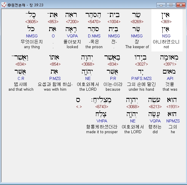 영어NASB,23 The chief jailer did not supervise anything under Joseph's charge because the LORD was with him; and whatever he did, the LORD made to prosper.