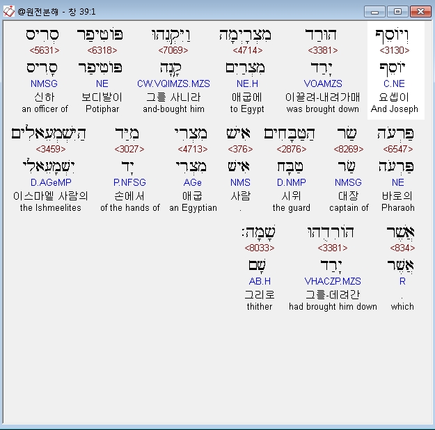 히브리어구약BHS,1 וְיֹוסֵף הוּרַד מִצְרָיְמָה וַיִּקְנֵהוּ פֹּוטִיפַר סְרִיס פַּרְעֹה שַׂר הַטַּבָּחִים אִישׁ מִצְרִי מִיַּד הַיִּשְׁמְעֵאלִים אֲשֶׁר הֹורִדֻהוּ שָׁמָּה׃