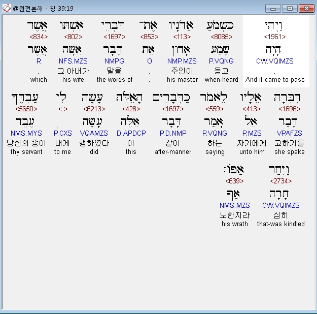 히브리어구약BHS,19 וַיְהִי כִשְׁמֹעַ אֲדֹנָיו אֶת־דִּבְרֵי אִשְׁתֹּו אֲשֶׁר דִּבְּרָה אֵלָיו לֵאמֹר כַּדְּבָרִים הָאֵלֶּה עָשָׂהּ לִי עַבְדֶּךָ וַיִּחַר אַפֹּו׃