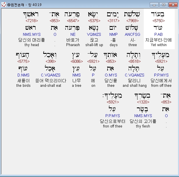히브리어구약BHS,19 בְּעֹוד שְׁלֹשֶׁת יָמִים יִשָּׂא פַרְעֹה אֶת־רֹאשְׁךָ מֵעָלֶיךָ וְתָלָה אֹותְךָ עַל־עֵץ וְאָכַל הָעֹוף אֶת־בְּשָׂרְךָ מֵעָלֶיךָ׃