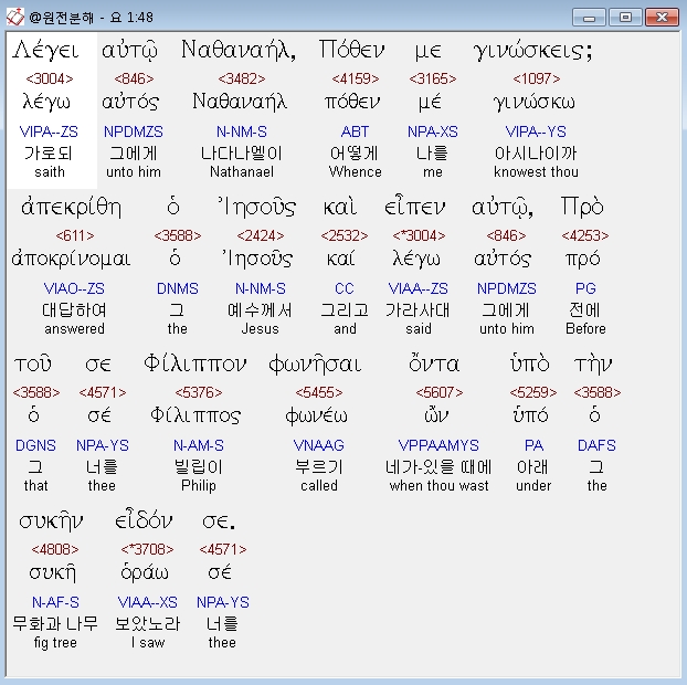 레게이 아우토 나다나엘 포덴 메 기노스케이스 아페크리데 예수스 카이 에이펜 아우토 프로 투 세 필맆폰 포네사이 온타 휘포 텐 쉬켄 에이돈 세
