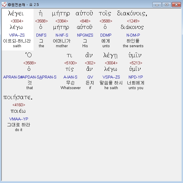 헬라어신약Stephanos,5 λεγει η μητηρ αυτου τοις διακονοις ο τι αν λεγη υμιν ποιησατε