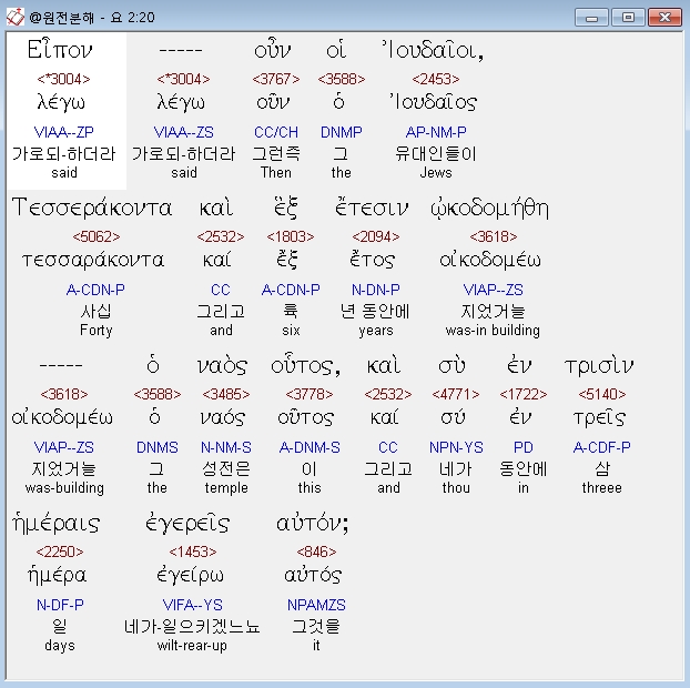 헬라어신약Stephanos,20 ειπον ουν οι ιουδαιοι τεσσαρακοντα και εξ ετεσιν ωκοδομηθη ο ναος ουτος και συ εν τρισιν ημεραις εγερεις αυτον