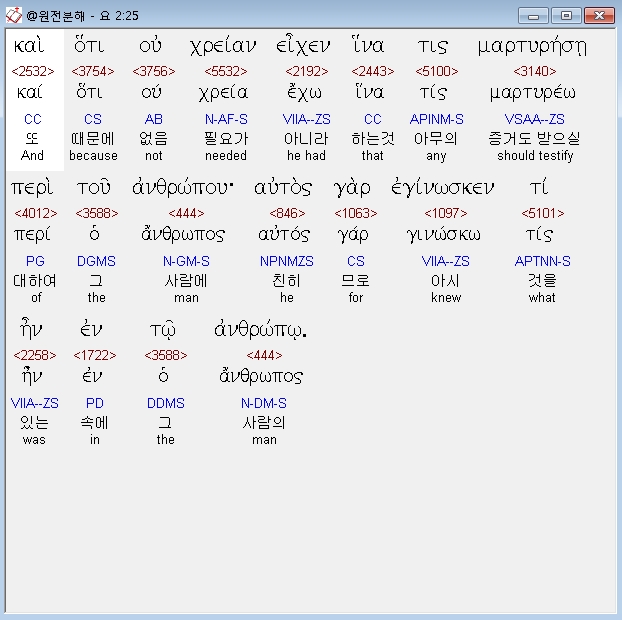 헬라어신약Stephanos,25 και οτι ου χρειαν ειχεν ινα τις μαρτυρηση περι του ανθρωπου αυτος γαρ εγινωσκεν τι ην εν τω ανθρωπω