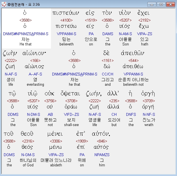 헬라어신약Stephanos,36 ο πιστευων εις τον υιον εχει ζωην αιωνιον ο δε απειθων τω υιω ουκ οψεται ζωην αλλ η οργη του θεου μενει επ αυτον