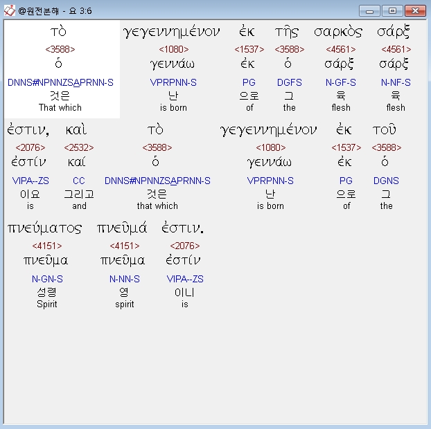 토 게겐네메논 에크 테스 사르코스 사릌스 에스틴 카이 토 게겐네메논 에크 투 프뉴마토스 프뉴마 에스틴