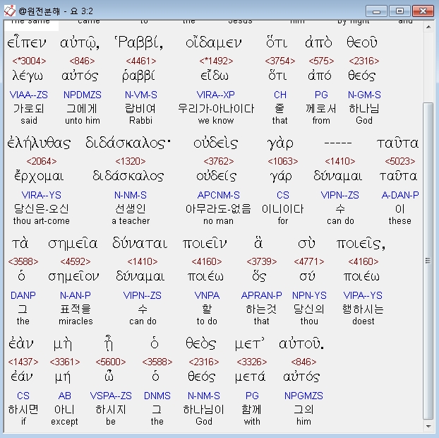 후토스 엘덴 프로스 아우톤 뉰토스 카이 에이펜 아우토 랍비 오이다멘 호티 아포 데우 엘렐뤼다스 디다스칼로스 우데이스 가르 뒤나타이 타우타 타 세메이아 포이에인 하 쉬 포이에이스 에안 메 에 호 데오스 멭 아우투