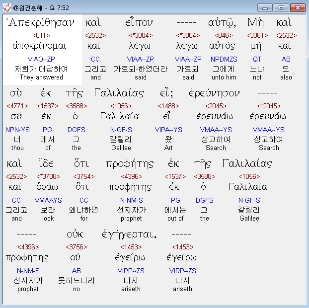 헬라어신약Stephanos,52 απεκριθησαν και ειπον αυτω μη και συ εκ της γαλιλαιας ει ερευνησον και ιδε οτι προφητης εκ της γαλιλαιας ουκ εγηγερται