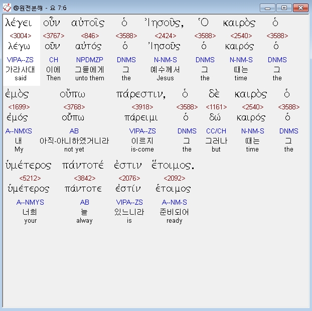 헬라어신약Stephanos,6 λεγει ουν αυτοις ο ιησους ο καιρος ο εμος ουπω παρεστιν ο δε καιρος ο υμετερος παντοτε εστιν ετοιμος