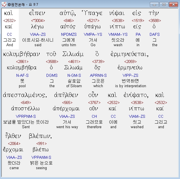 헬라어신약Stephanos,7 και ειπεν αυτω υπαγε νιψαι εις την κολυμβηθραν του σιλωαμ ο ερμηνευεται απεσταλμενος απηλθεν ουν και ενιψατο και ηλθεν βλεπων