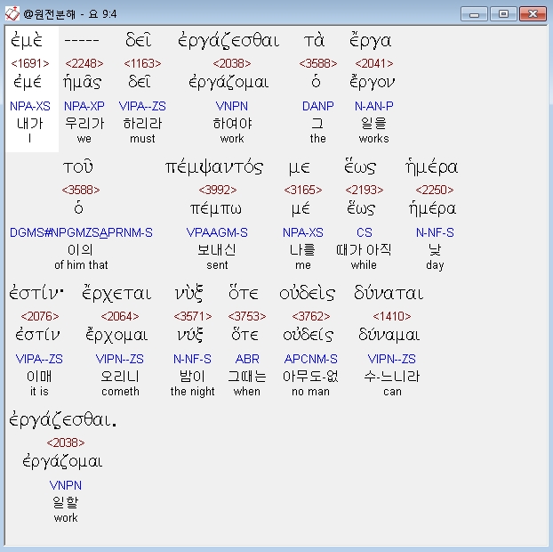 헬라어신약Stephanos,4 εμε δει εργαζεσθαι τα εργα του πεμψαντος με εως ημερα εστιν ερχεται νυξ οτε ουδεις δυναται εργαζεσθαι
