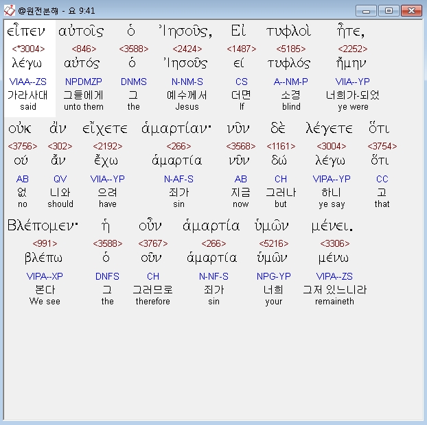 헬라어신약Stephanos,41 ειπεν αυτοις ο ιησους ει τυφλοι ητε ουκ αν ειχετε αμαρτιαν νυν δε λεγετε οτι βλεπομεν η ουν αμαρτια υμων μενει