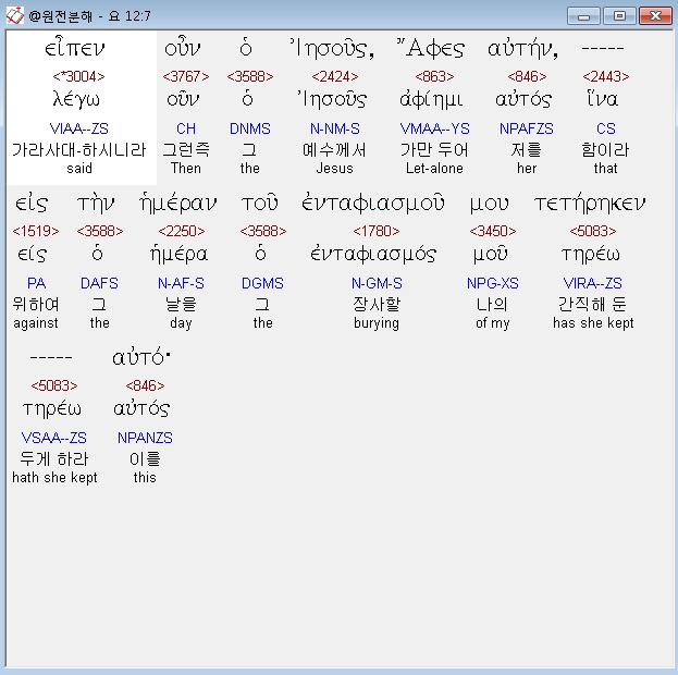 헬라어신약Stephanos,7 ειπεν ουν ο ιησους αφες αυτην εις την ημεραν του ενταφιασμου μου τετηρηκεν αυτο