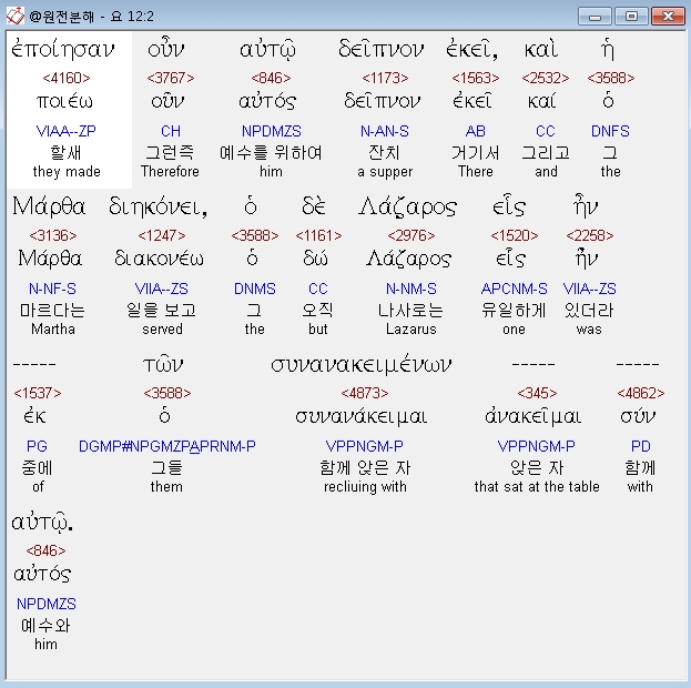 헬라어신약Stephanos,2 εποιησαν ουν αυτω δειπνον εκει και η μαρθα διηκονει ο δε λαζαρος εις ην των συνανακειμενων αυτω