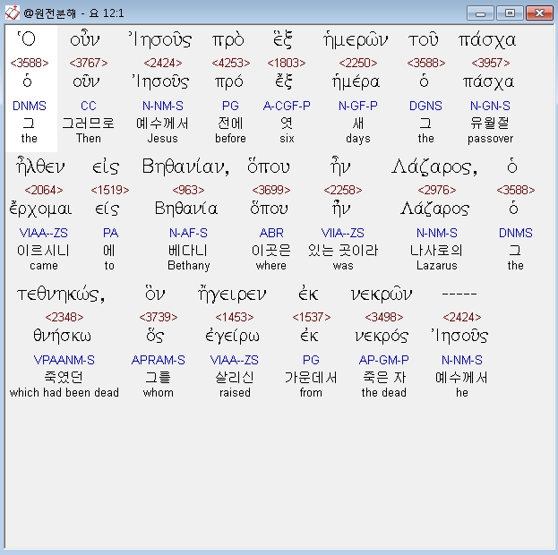 헬라어신약Stephanos,1 ο ουν ιησους προ εξ ημερων του πασχα ηλθεν εις βηθανιαν οπου ην λαζαρος ο τεθνηκως ον ηγειρεν εκ νεκρων