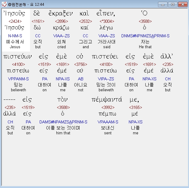 헬라어신약Stephanos,44 ιησους δε εκραξεν και ειπεν ο πιστευων εις εμε ου πιστευει εις εμε αλλ εις τον πεμψαντα με
