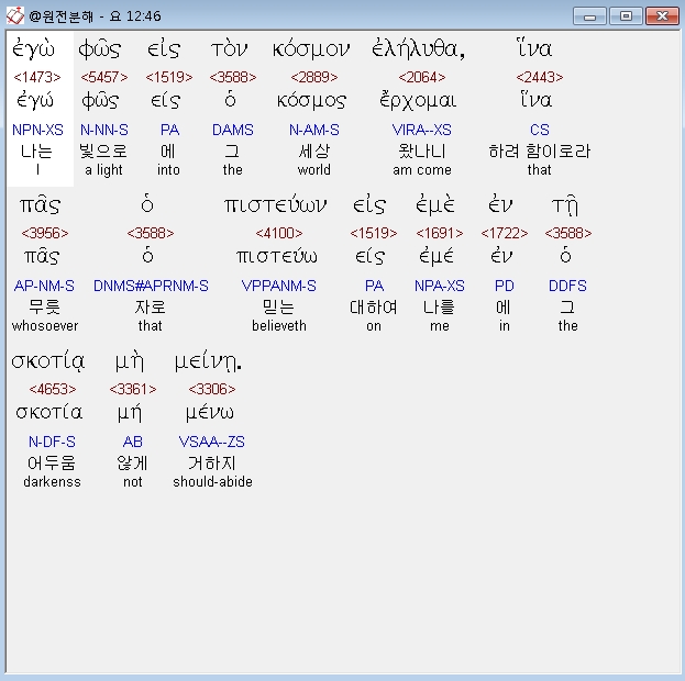 헬라어신약Stephanos,46 εγω φως εις τον κοσμον εληλυθα ινα πας ο πιστευων εις εμε εν τη σκοτια μη μεινη