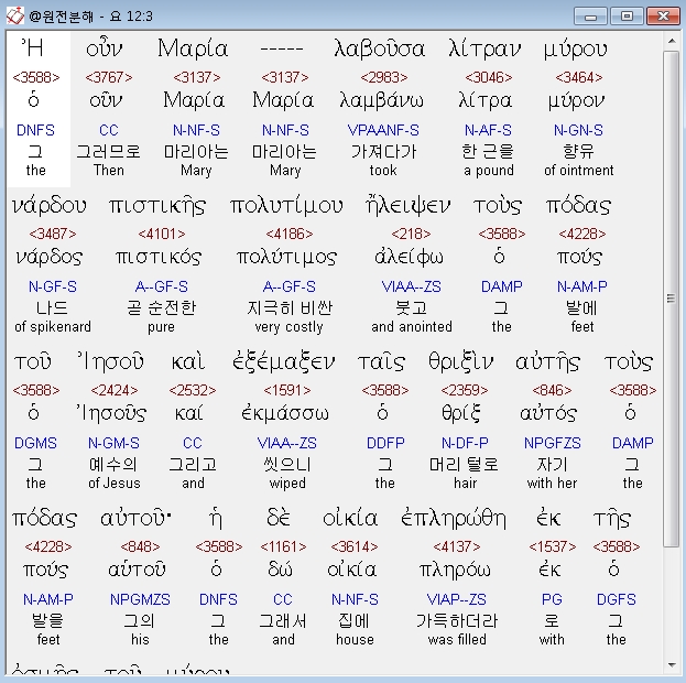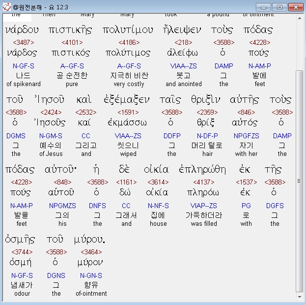 헬라어신약Stephanos,3 η ουν μαρια λαβουσα λιτραν μυρου ναρδου πιστικης πολυτιμου ηλειψεν τους ποδας του ιησου και εξεμαξεν ταις θριξιν αυτης τους ποδας αυτου η δε οικια επληρωθη εκ της οσμης του μυρου