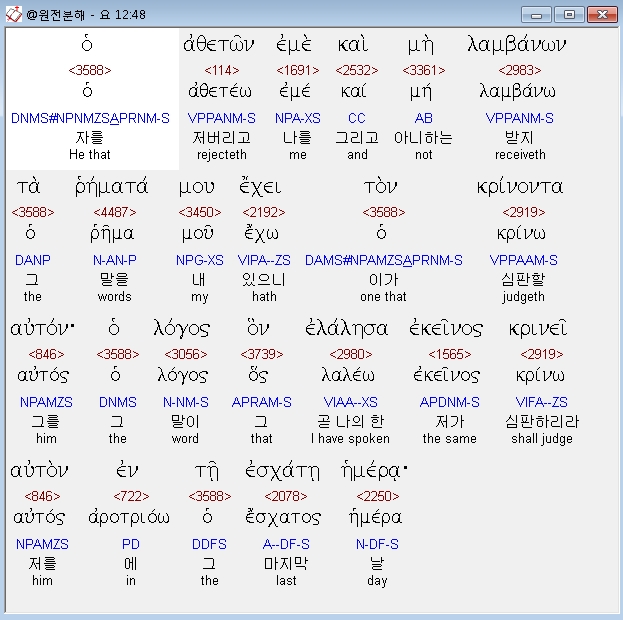 헬라어신약Stephanos,48 ο αθετων εμε και μη λαμβανων τα ρηματα μου εχει τον κρινοντα αυτον ο λογος ον ελαλησα εκεινος κρινει αυτον εν τη εσχατη ημερα