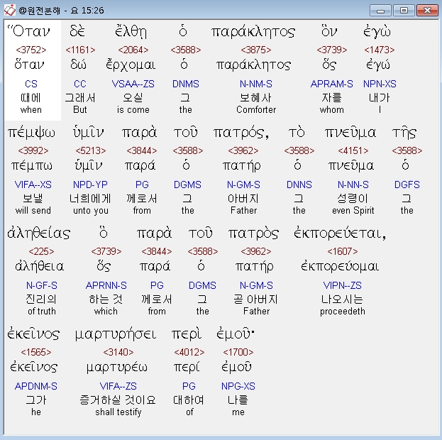 오탄 엘데 호 파라클레토스 혼 에고 펨프소 휘민 파라 투 파트로스 토 프뉴마 테스 알레데이아스 호 파라 투 파트로스 에크포류에타이 에케이노스 마르튀레세이 페리 에무