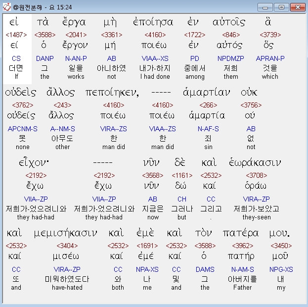 헬라어신약Stephanos,24 ει τα εργα μη εποιησα εν αυτοις α ουδεις αλλος πεποιηκεν αμαρτιαν ουκ ειχον νυν δε και εωρακασιν και μεμισηκασιν και εμε και τον πατερα μου