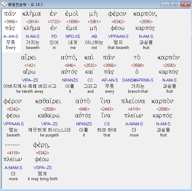헬라어신약Stephanos,2 παν κλημα εν εμοι μη φερον καρπον αιρει αυτο και παν το καρπον φερον καθαιρει αυτο ινα πλειονα καρπον φερη