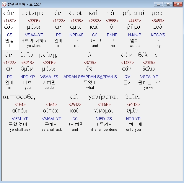헬라어신약Stephanos,7 εαν μεινητε εν εμοι και τα ρηματα μου εν υμιν μεινη ο εαν θελητε αιτησεσθε και γενησεται υμιν