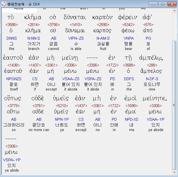 헬라어신약Stephanos,4 μεινατε εν εμοι καγω εν υμιν καθως το κλημα ου δυναται καρπον φερειν αφ εαυτου εαν μη μεινη εν τη αμπελω ουτως ουδε υμεις εαν μη εν εμοι μεινητε