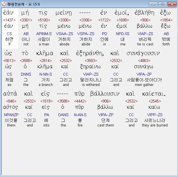 헬라어신약Stephanos,6 εαν μη τις μεινη εν εμοι εβληθη εξω ως το κλημα και εξηρανθη και συναγουσιν αυτα και εις πυρ βαλλουσιν και καιεται