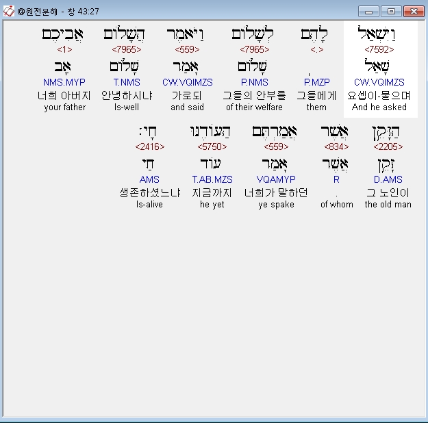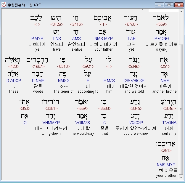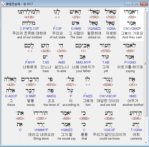 히브리어구약BHS,7 וַיֹּאמְרוּ שָׁאֹול שָׁאַל־הָאִישׁ לָנוּ וּלְמֹולַדְתֵּנוּ לֵאמֹר הַעֹוד אֲבִיכֶם חַי הֲיֵשׁ לָכֶם אָח וַנַגֶּד־לֹו עַל־פִּי הַדְּבָרִים הָאֵלֶּה הֲיָדֹועַ נֵדַע כִּי יֹאמַר הֹורִידוּ אֶת־אֲחִיכֶם׃