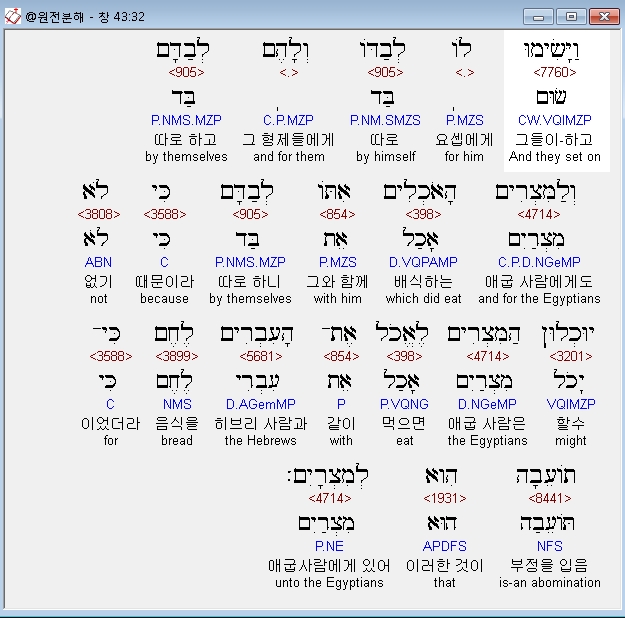 히브리어구약BHS,32 וַיָּשִׂימוּ לֹו לְבַדֹּו וְלָהֶם לְבַדָּם וְלַמִּצְרִים הָאֹכְלִים אִתֹּו לְבַדָּם כִּי לֹא יוּכְלוּן הַמִּצְרִים לֶאֱכֹל אֶת־הָעִבְרִים לֶחֶם כִּי־תֹועֵבָה הִוא לְמִצְרָיִם׃