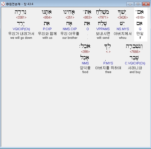 히브리어구약BHS,4 אִם־יֶשְׁךָ מְשַׁלֵּחַ אֶת־אָחִינוּ אִתָּנוּ נֵרְדָה וְנִשְׁבְּרָה לְךָ אֹכֶל׃