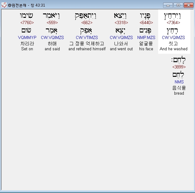 히브리어구약BHS,31 וַיִּרְחַץ פָּנָיו וַיֵּצֵא וַיִּתְאַפַּק וַיֹּאמֶר שִׂימוּ לָחֶם׃