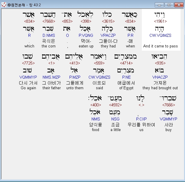 히브리어구약BHS,2 וַיְהִי כַּאֲשֶׁר כִּלּוּ לֶאֱכֹל אֶת־הַשֶּׁבֶר אֲשֶׁר הֵבִיאוּ מִמִּצְרָיִם וַיֹּאמֶר אֲלֵיהֶם אֲבִיהֶם שֻׁבוּ שִׁבְרוּ־לָנוּ מְעַט־אֹכֶל׃