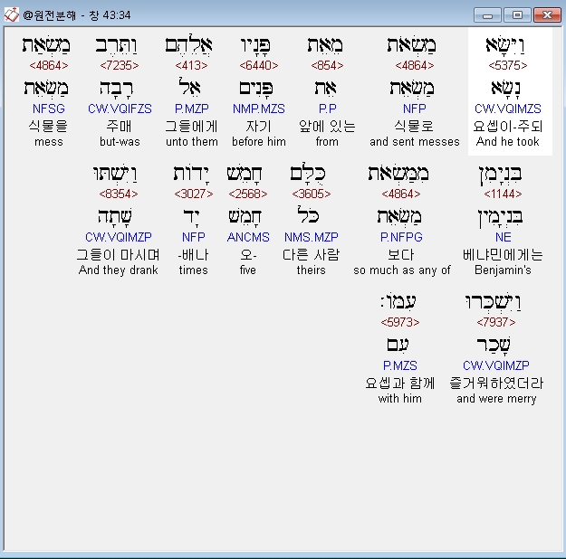 히브리어구약BHS,34 וַיִּשָּׂא מַשְׂאֹת מֵאֵת פָּנָיו אֲלֵהֶם וַתֵּרֶב מַשְׂאַת בִּנְיָמִן מִמַּשְׂאֹת כֻּלָּם חָמֵשׁ יָדֹות וַיִּשְׁתּוּ וַיִּשְׁכְּרוּ עִמֹּו׃