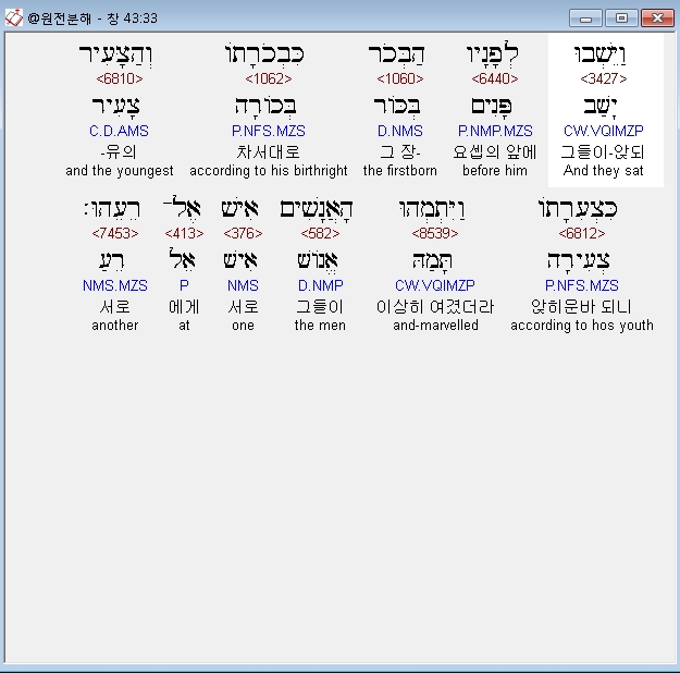 히브리어구약BHS,33 וַיֵּשְׁבוּ לְפָנָיו הַבְּכֹר כִּבְכֹרָתֹו וְהַצָּעִיר כִּצְעִרָתֹו וַיִּתְמְהוּ הָאֲנָשִׁים אִישׁ אֶל־רֵעֵהוּ׃