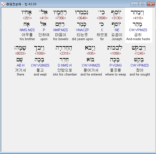 히브리어구약BHS,30 וַיְמַהֵר יֹוסֵף כִּי־נִכְמְרוּ רַחֲמָיו אֶל־אָחִיו וַיְבַקֵּשׁ לִבְכֹּות וַיָּבֹא הַחַדְרָה וַיֵּבְךְּ שָׁמָּה׃