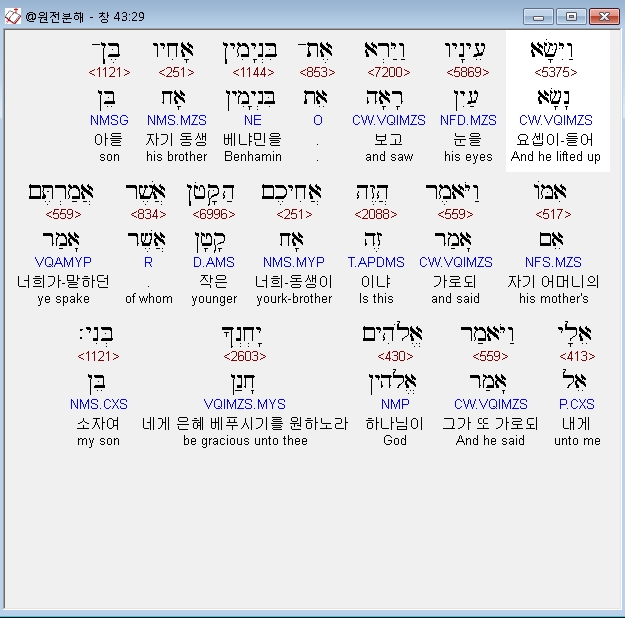 히브리어구약BHS,29 וַיִּשָּׂא עֵינָיו וַיַּרְא אֶת־בִּנְיָמִין אָחִיו בֶּן־אִמֹּו וַיֹּאמֶר הֲזֶה אֲחִיכֶם הַקָּטֹן אֲשֶׁר אֲמַרְתֶּם אֵלָי וַיֹּאמַר אֱלֹהִים יָחְנְךָ בְּנִי׃