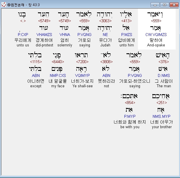 히브리어구약BHS,3 וַיֹּאמֶר אֵלָיו יְהוּדָה לֵאמֹר הָעֵד הֵעִד בָּנוּ הָאִישׁ לֵאמֹר לֹא־תִרְאוּ פָנַי בִּלְתִּי אֲחִיכֶם אִתְּכֶם׃