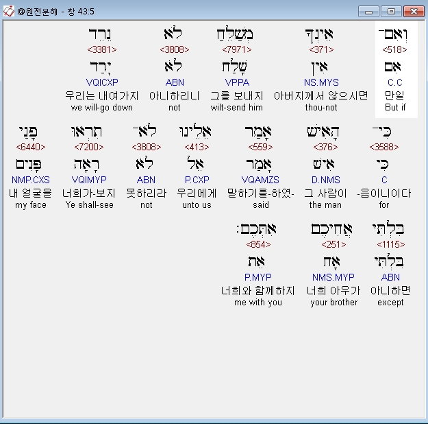 히브리어구약BHS,5 וְאִם־אֵינְךָ מְשַׁלֵּחַ לֹא נֵרֵד כִּי־הָאִישׁ אָמַר אֵלֵינוּ לֹא־תִרְאוּ פָנַי בִּלְתִּי אֲחִיכֶם אִתְּכֶם׃