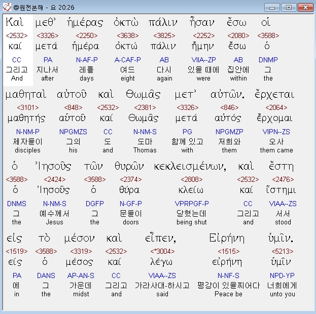 헬라어신약Stephanos,26 και μεθ ημερας οκτω παλιν ησαν εσω οι μαθηται αυτου και θωμας μετ αυτων ερχεται ο ιησους των θυρων κεκλεισμενων και εστη εις το μεσον και ειπεν ειρηνη υμιν