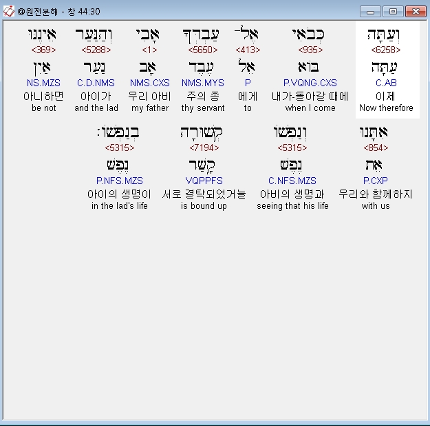 히브리어구약BHS,30 וְעַתָּה כְּבֹאִי אֶל־עַבְדְּךָ אָבִי וְהַנַּעַר אֵינֶנּוּ אִתָּנוּ וְנַפְשֹׁו קְשׁוּרָה בְנַפְשֹׁו׃