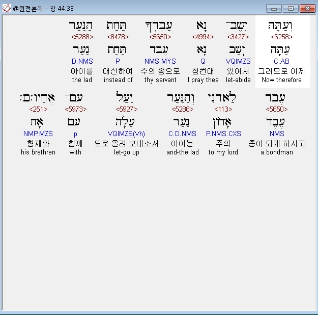 히브리어구약BHS,33 וְעַתָּה יֵשֶׁב־נָא עַבְדְּךָ תַּחַת הַנַּעַר עֶבֶד לַאדֹנִי וְהַנַּעַר יַעַל עִם־אֶחָיו׃
