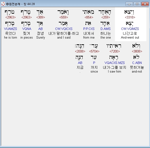 히브리어구약BHS,28 וַיֵּצֵא הָאֶחָד מֵאִתִּי וָאֹמַר אַךְ טָרֹף טֹרָף וְלֹא רְאִיתִיו עַד־הֵנָּה׃