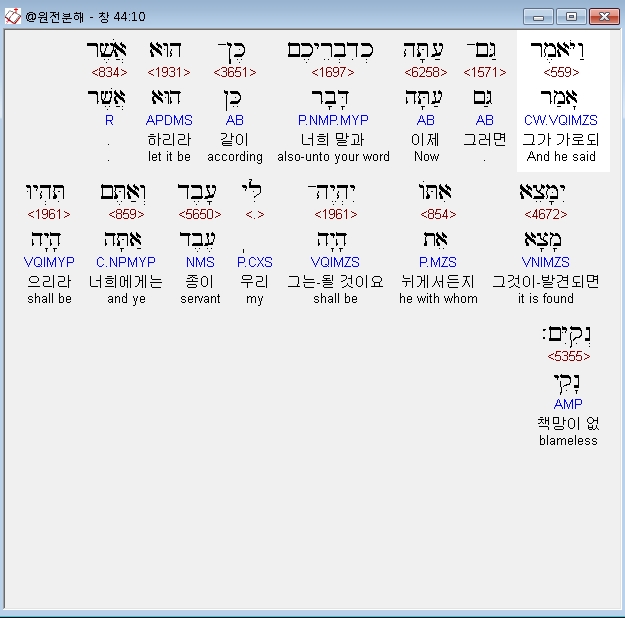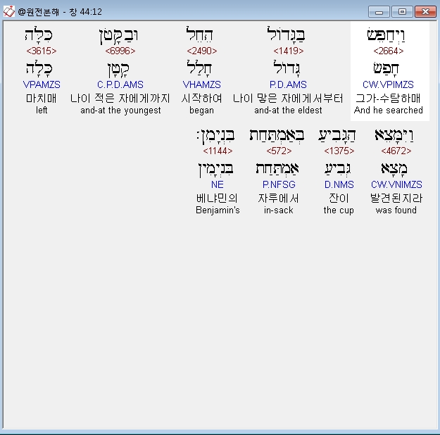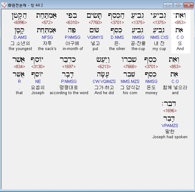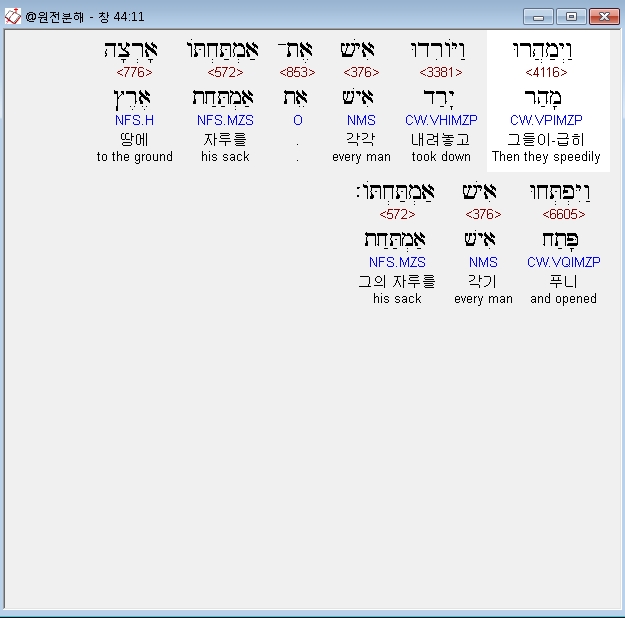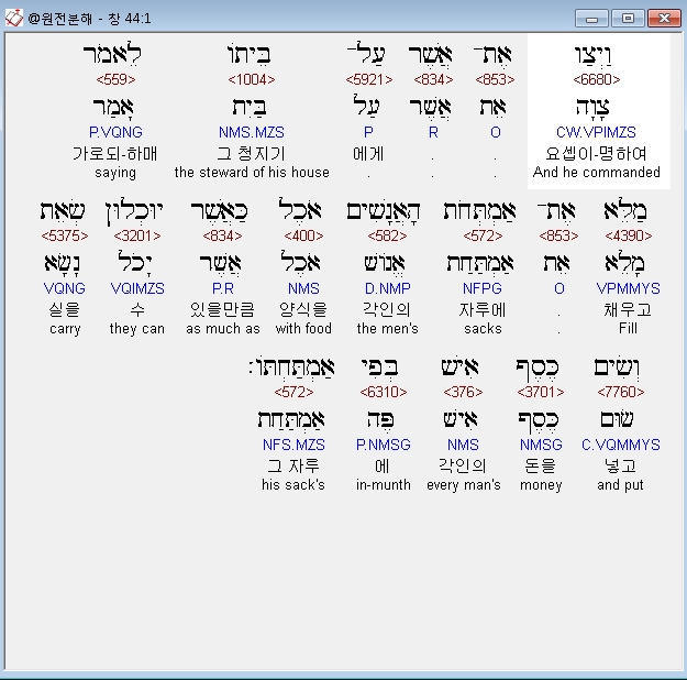 히브리어구약BHS,1 וַיְצַו אֶת־אֲשֶׁר עַל־בֵּיתֹו לֵאמֹר מַלֵּא אֶת־אַמְתְּחֹת הָאֲנָשִׁים אֹכֶל כַּאֲשֶׁר יוּכְלוּן שְׂאֵת וְשִׂים כֶּסֶף־אִישׁ בְּפִי אַמְתַּחְתֹּו׃