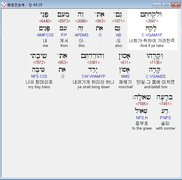 히브리어구약BHS,29 וּלְקַחְתֶּם גַּם־אֶת־זֶה מֵעִם פָּנַי וְקָרָהוּ אָסֹון וְהֹורַדְתֶּם אֶת־שֵׂיבָתִי בְּרָעָה שְׁאֹלָה׃