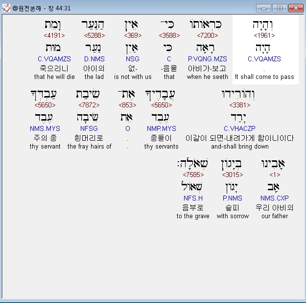 히브리어구약BHS,31 וְהָיָה כִּרְאֹותֹו כִּי־אֵין הַנַּעַר וָמֵת וְהֹורִידוּ עֲבָדֶיךָ אֶת־שֵׂיבַת עַבְדְּךָ אָבִינוּ בְּיָגֹון שְׁאֹלָה׃