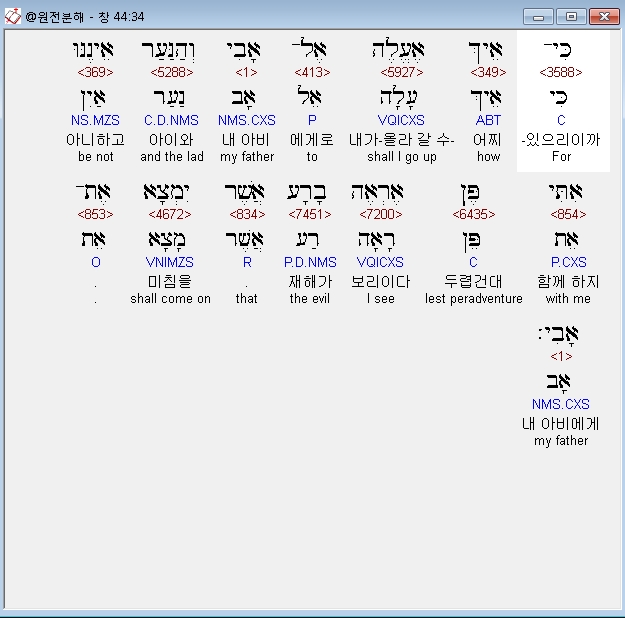 히브리어구약BHS,34 כִּי־אֵיךְ אֶעֱלֶה אֶל־אָבִי וְהַנַּעַר אֵינֶנּוּ אִתִּי פֶּן אֶרְאֶה בָרָע אֲשֶׁר יִמְצָא אֶת־אָבִי׃