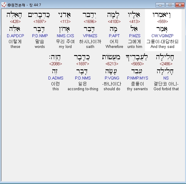 히브리어구약BHS,7 וַיֹּאמְרוּ אֵלָיו לָמָּה יְדַבֵּר אֲדֹנִי כַּדְּבָרִים הָאֵלֶּה חָלִילָה לַעֲבָדֶיךָ מֵעֲשֹׂות כַּדָּבָר הַזֶּה׃